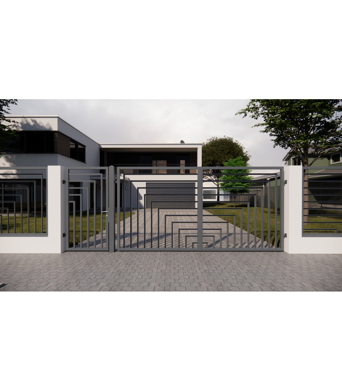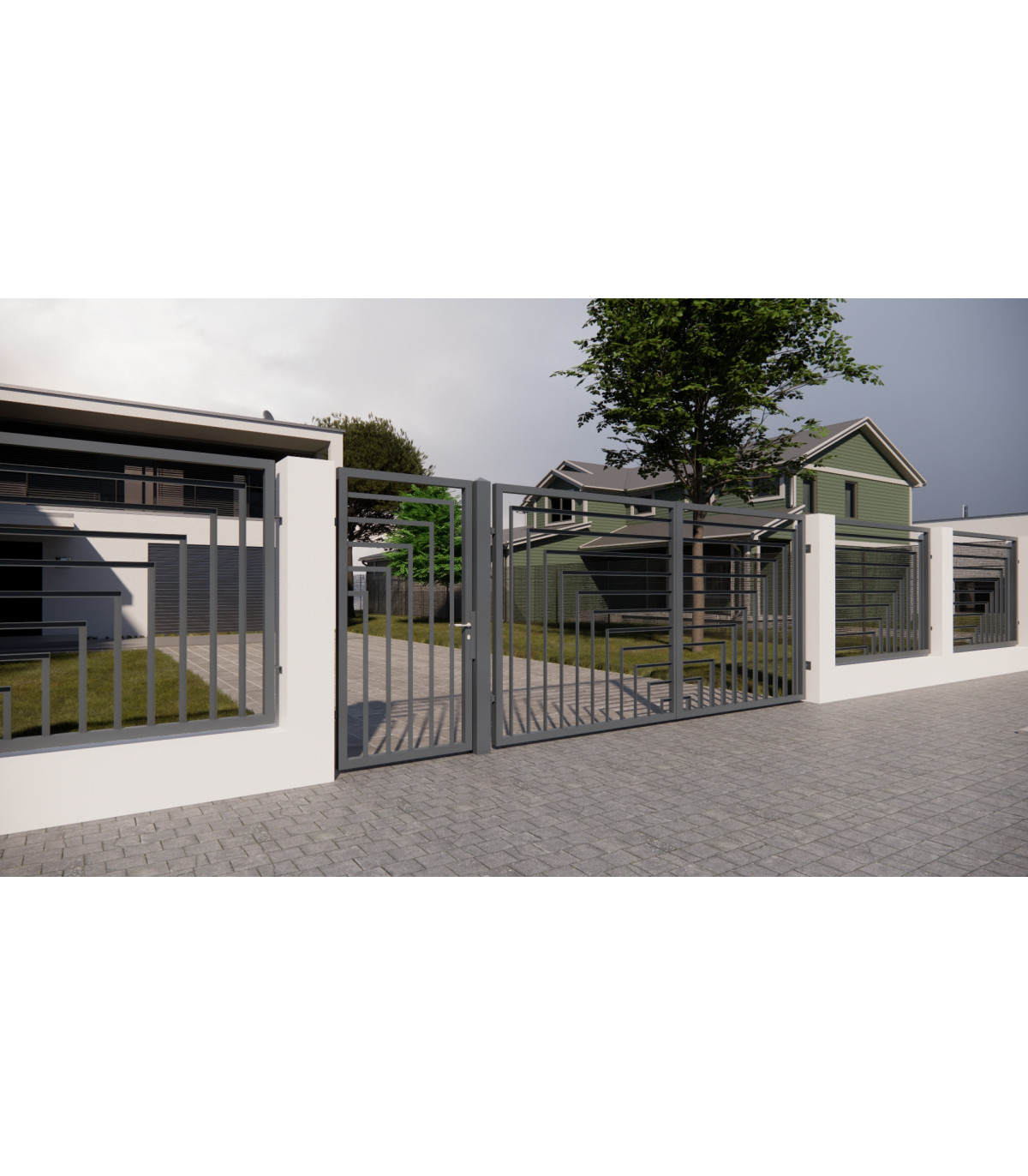 Poarta pietonala si auto de gard modern cu design de bare amplasate orizontale si verticale din cornier.